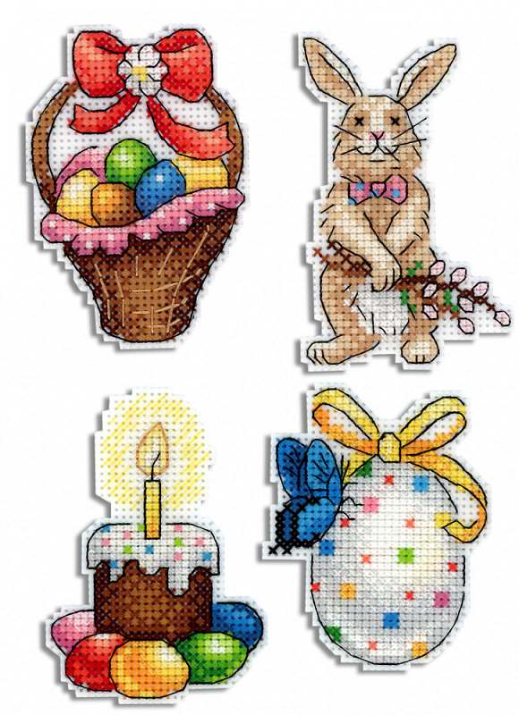 Состав:пластиковая канва, нитки мулине, фетр белого цвета. магнитное полотно, схема для четырех сюжетов и руководство по вышиванию.